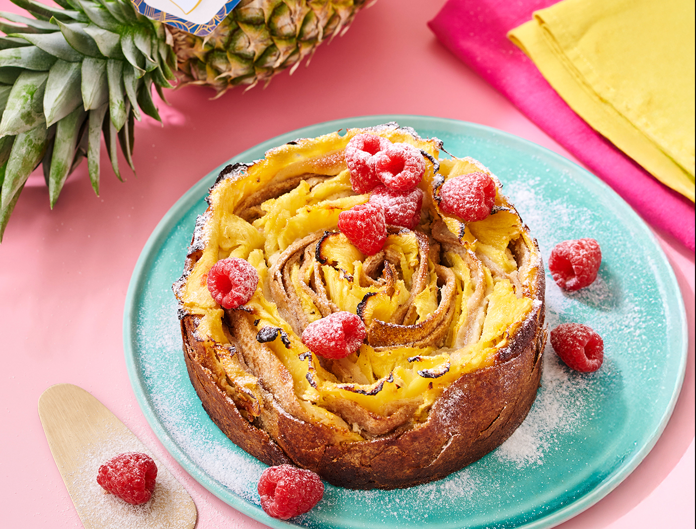 Eigelb mit Hafermilch verquirlen. Wraps halbieren, runde Seite etwas begradigen. Die 10 Halbkreise mit Creme bestreichen, jeweils ca. 4 Ananasscheiben auflegen und mittig zusammenklappen. Einen Streifen aufrollen, dann nacheinander die anderen streifenförmig darumwickeln. Die Schnecke auf den mit Backpapier belegten Boden einer Springform stellen. Rand einpinseln und umlegen.