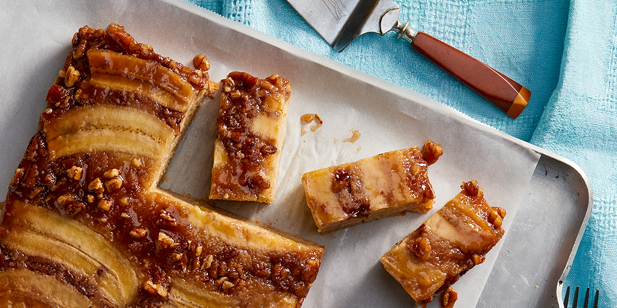 2. Melt buttery spread in a medium skillet over medium-high heat; whisk in brown sugar and heat to a simmer. Simmer 2 minutes, whisking frequently; spread in bottom of prepared dish. Place bananas, cut side down, over butter mixture; sprinkle with pecans.