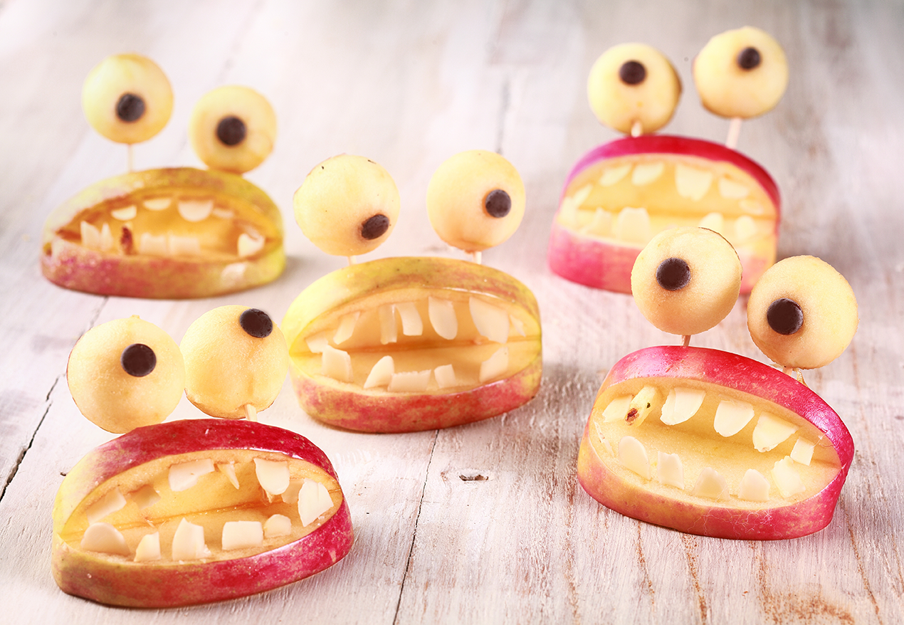 È davvero facile: taglia una mela in 4 parti e, in ciascuna di esse all’esterno, fai un’incisione della larghezza di un dito per creare la bocca; con le scaglie di mandorla crea i denti. Per un aspetto ancora più spaventoso, posiziona le scaglie di mandorla in modo irregolare! Con l’aiuto di un cucchiaino, scava la polpa di un'altra mela, così da ottenere due palline: applica una goccia di cioccolato su ognuna e infilza gli occhi con uno stuzzicante, unendoli alla bocca di mela.