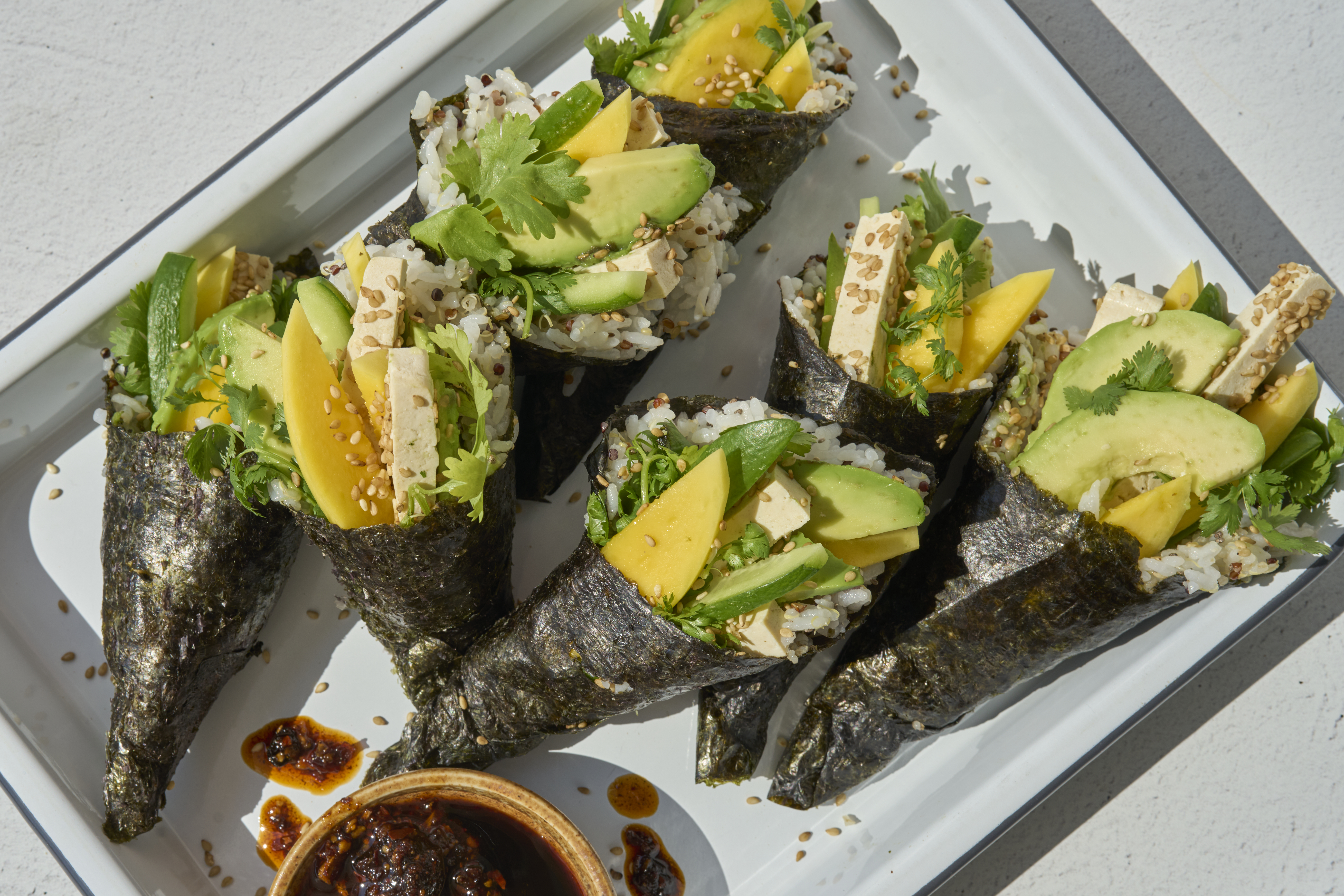 Place a half-sheet of nori shiny side down in your hand or on a clean surface, with the short edge closest to you. Spread about ¼ cup sushi rice in a square on one half of the nori. Layer a few slices of tofu, mango, cucumber, avocado, and a sprig of cilantro on top of the rice. Sprinkle with sesame seeds for extra texture. Fold the nori over and around the fillings and roll the rest of the nori around into a cone shape, pressing and using a bit of water to seal.